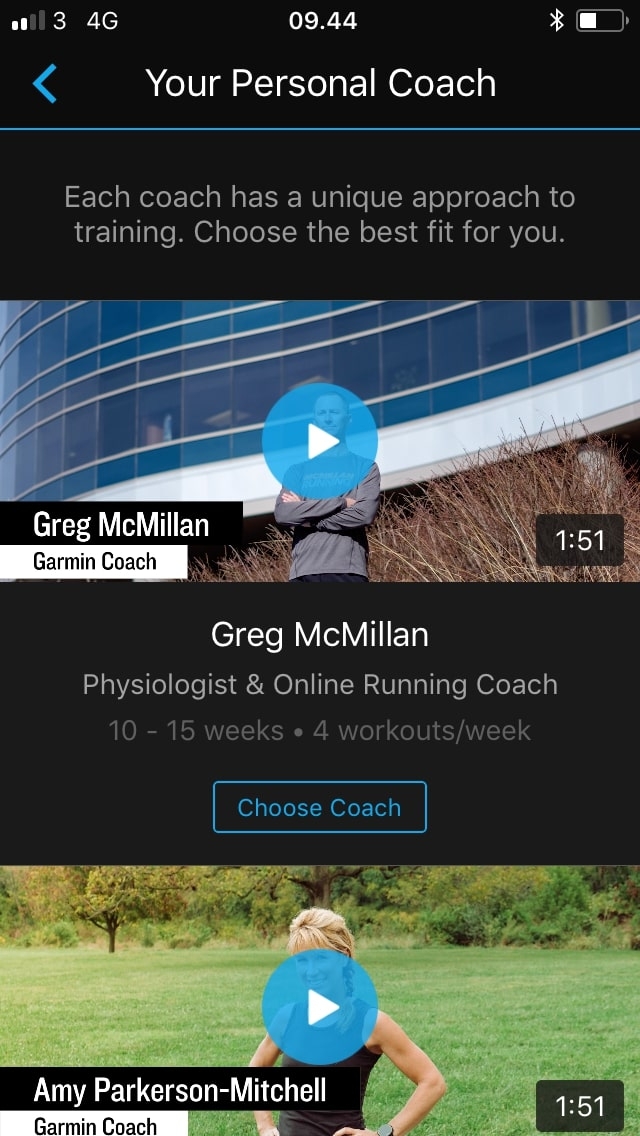 gir deg din egen personlige løpetrener. Via Garmin Connect-appen kan du velge ditt løpemål, hvilken form du er i, samt hvilken personlig trener du ønsker. Garmin Coach kommer deretter med et personlig treningsprogram til deg, som du både kan få tilgang til i Garmin Connect på datamaskinen eller i appen på telefonen - den legger også inn treningen på klokka di, så du bare skal starte treningen og løpe akkurat det klokka sier.